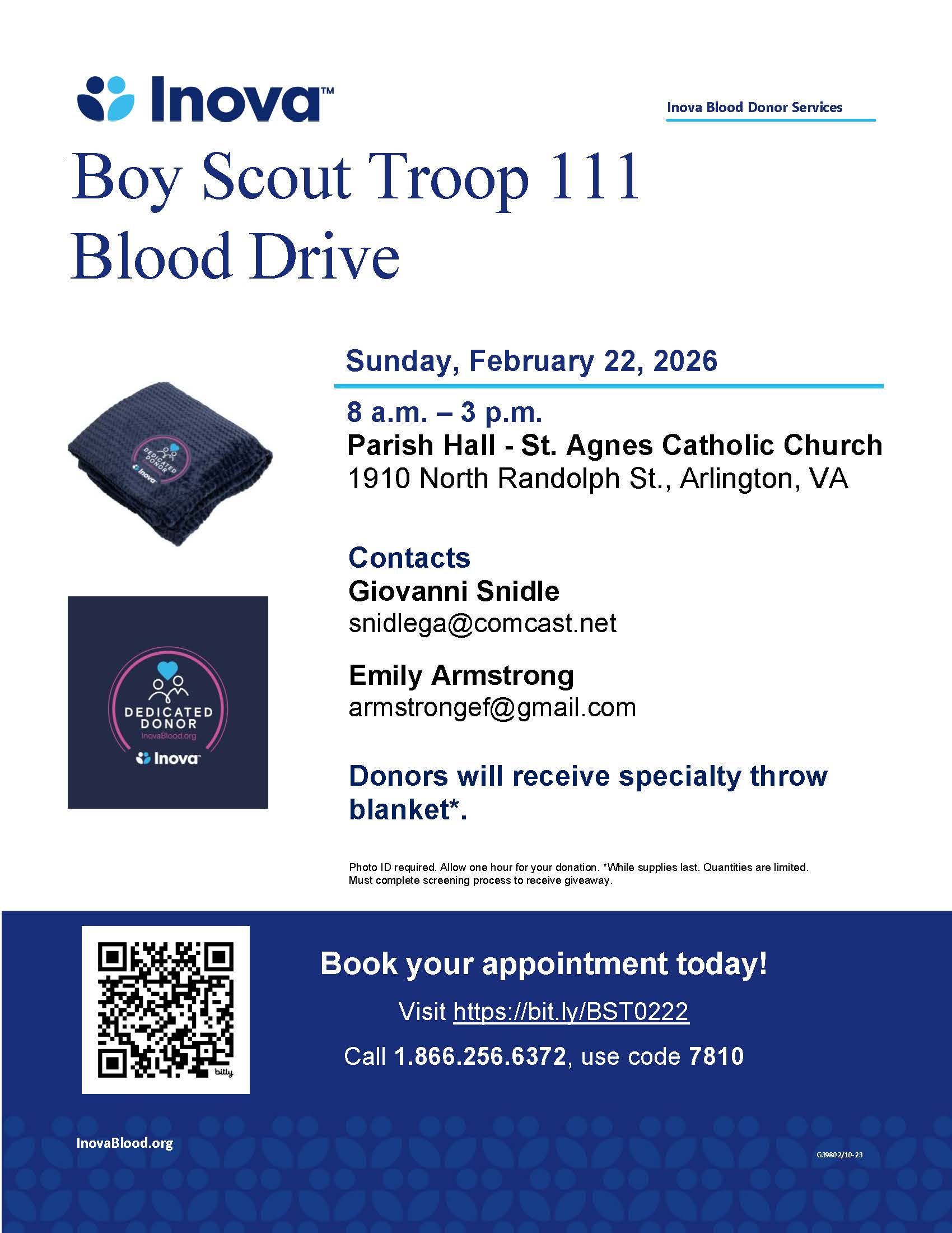 The Inova Blood Donor Services team will be in the Parish Hall Sunday, Feb. 22nd from 8 AM to 2 PM for the annual Scout Troop 111 blood drive. We are now recruiting donors to give blood. Any donations are greatly appreciated as INOVA has a critical need for all blood types. You can sign up by visiting https://www.inovabloodsaves.org/donor/schedules/drive_schedule/35623