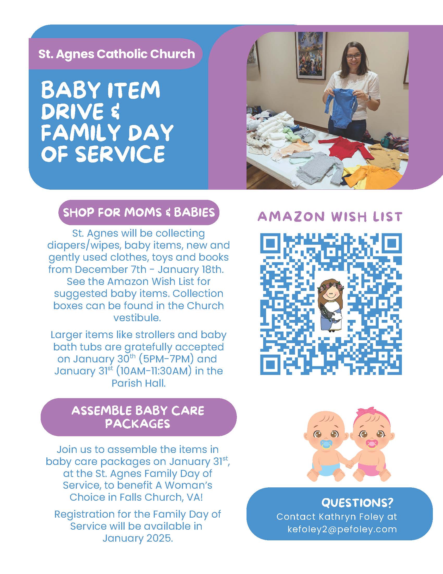 Show some love to mothers and babies in need by donating baby items now through January 18th. Collection boxes can be found in the Church vestibule and will benefit A Woman’s Choice, a crisis pregnancy centers in Falls Church. See below for more information.