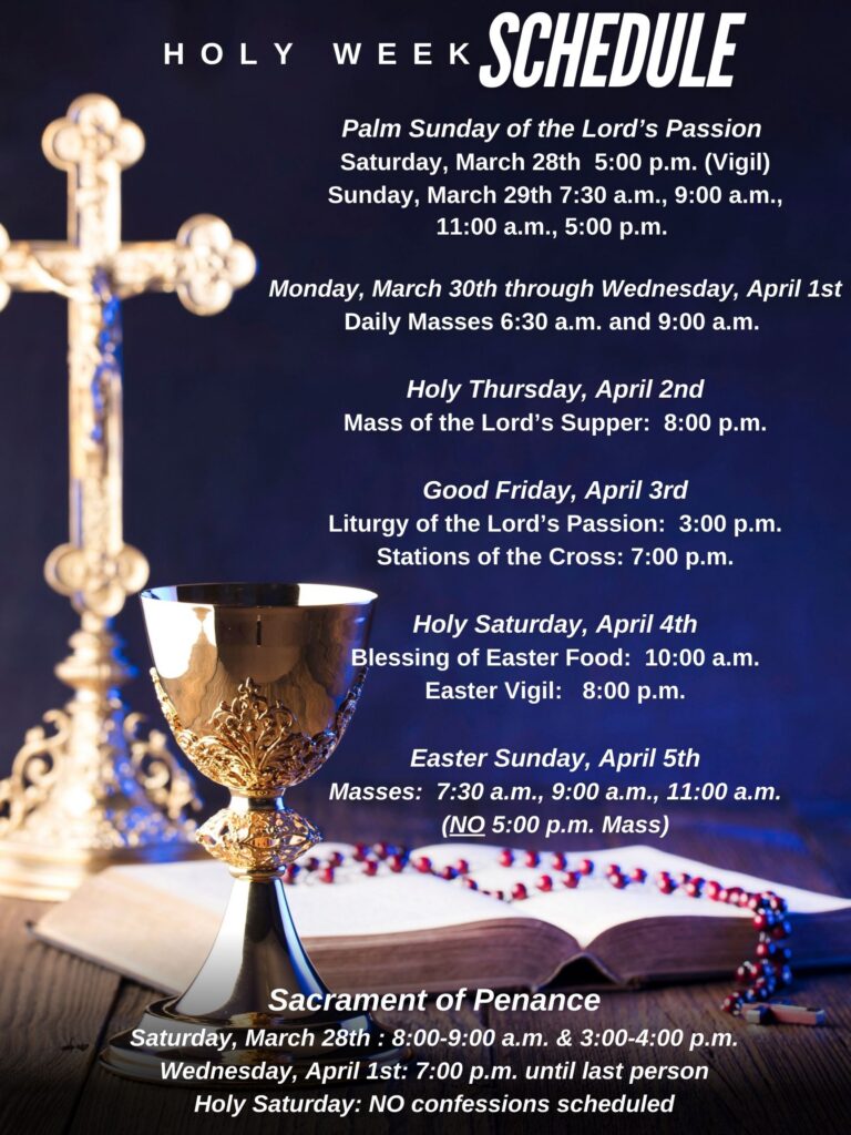 The Parish Office will be CLOSED Holy Thursday, April 2nd through Easter Monday, April 6th. We will reopen on Tuesday, April 7th at 9:30 a.m.