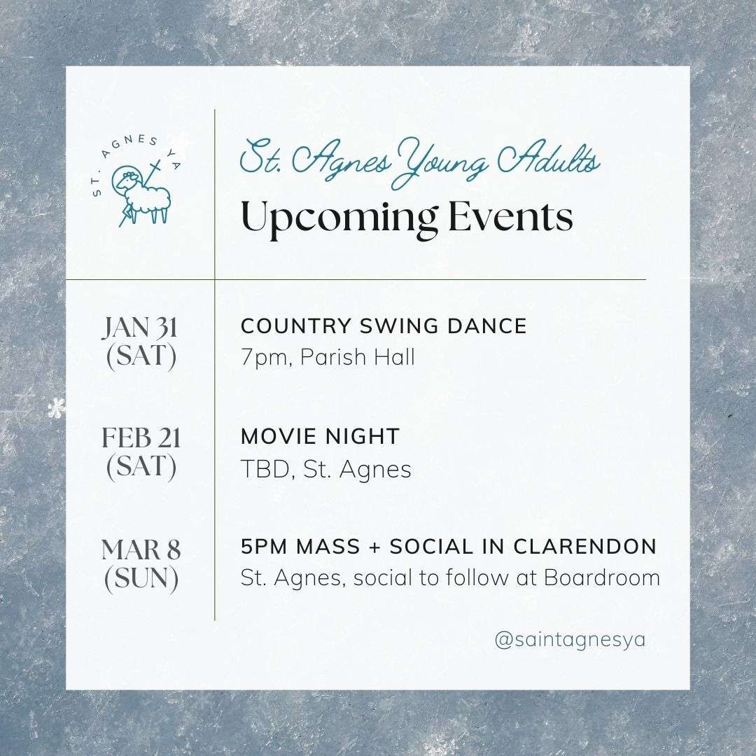 Saint Agnes Young Adult Ministry caters to young adults, married or single, ages 21-35.