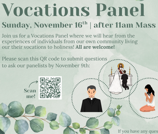 Please join us for a Vocations Panel on Sunday, November 16th after the 11am Mass in the Parish Hall. We will hear from the experiences of individuals in our own community, including Father Oetjen and Sister Marie Benedict, F.S.E., as well as a married couple and single woman from St. Agnes!